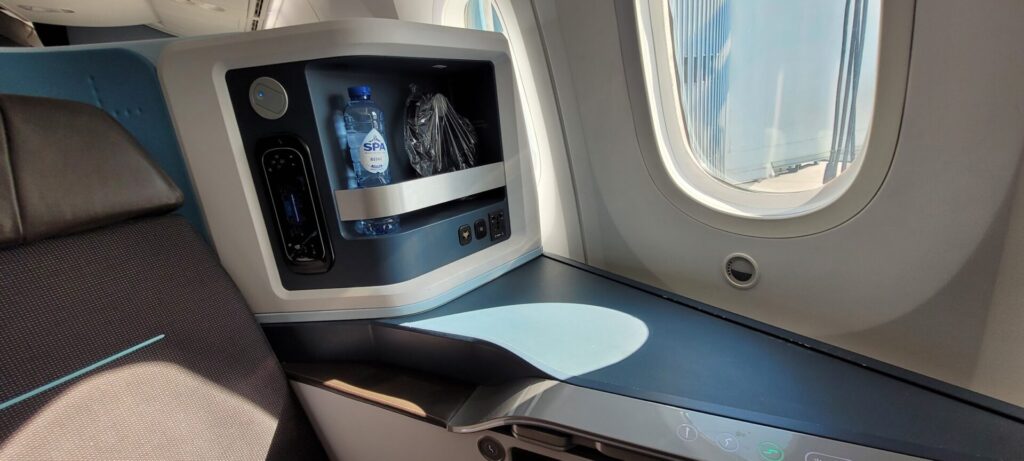 At my seat was a rather unique amenities bag, emphasis on ‘bag’ – more on that later! Additionally, a 500ml bottle of Spa still mineral water and a sanitized, sealed noise-cancelling headset were in the small console.