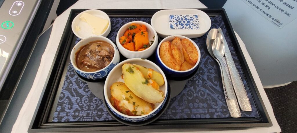 I’ve had this meal before on KLM, and it was a bit odd, once again. The beef short rib was really delicious, but it was only a tiny portion. The gravy surrounding the rib was really good, and the meat was succulent, like it had been slow-cooked for 12 hours. The carrots were fine, but the potatoes were quite undercooked.